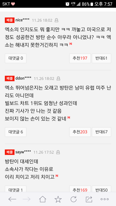 2,3번째 베플 스엠이 방탄 앞길 막는것처럼 써놨는데