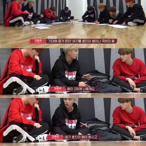 음악적 지식이 더 많고 경력이 있는 최종호 연습생과 김홍중 연습생이 파트 분배를 먼저 이끌어나가게 됨. 이때 효진이가 많이 당황한 모습을 보이고 안절부절 못하다가 곡.. 곡이라며 말을 내뱉음.