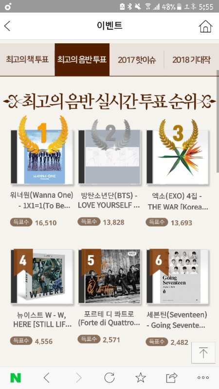 대체 왜 하는지 모르는 투표긴한디 1위하면 최고의음반으로 뽑힌대 안할수 없잖아 다른팀 5분에 12표 오르구 우리 2표오름ㅋㅋ 그중 하나는 내꺼고 이 투표자체를 잘 모르는듯 우리가 1위하자 지금 3위인데 차이가 안커서 퍼뜨리면 금방 1위할듯 sns계정으로 투표가능하니까 가능한 다섯개다해 나는 네개했어