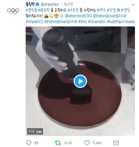 평창계정도아니고 올림픽공식계정에서 찬열생일축하한다고 영상에 케이크까지 만들어서 올려주는 클라스 애지고요 지리고요 평창올림픽 모델 엑소임? 왜이렇게 잘해주는거임?