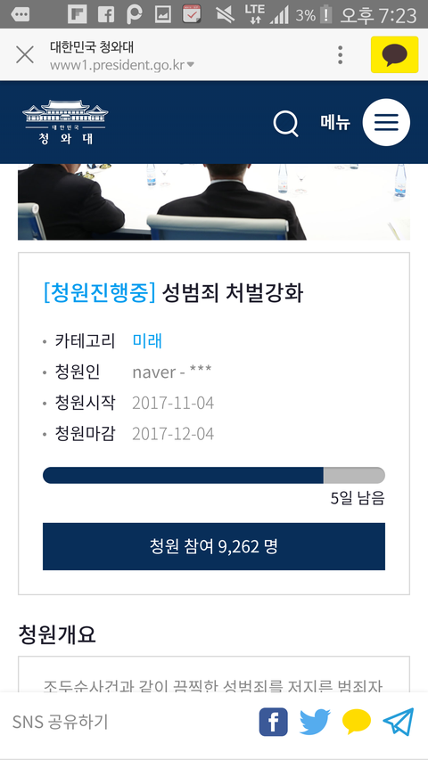지금 성범죄 처벌 강화 청원 동의 기간이 5일 남짓 남았거든.
