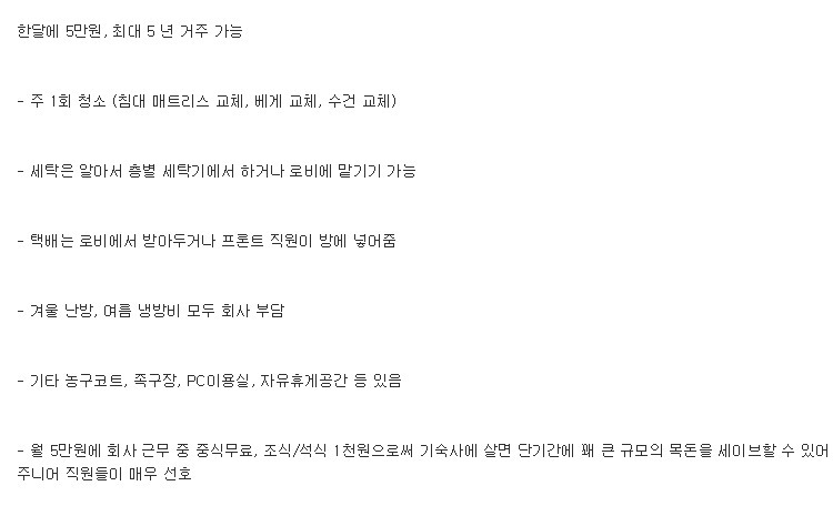 1회 비용 월 5만원인 국내 모 대기업 기숙사