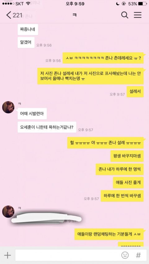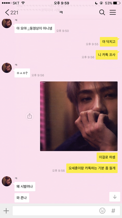 ㅋㅋㅋㅋㅋㅋㅋㅋㅋ 아 개쳐웃기네 ㅋㅋㅋㅋ 근데 깨톡할때마다 조카 설레서 나 원래 답장 조카 느린데 개빨리해줄듯 ㅎㅎ 그리고 나 최애 차애같은거 없음 ㅇㅇ 갑자기 저 사진이 눈에 들어와서 하라고 한 거 물론 내 프사도 저거랑 똑같은 사진임 ㅎㅎ 이만 실컷 웃었으니 투표하러 안녕 ~!~!