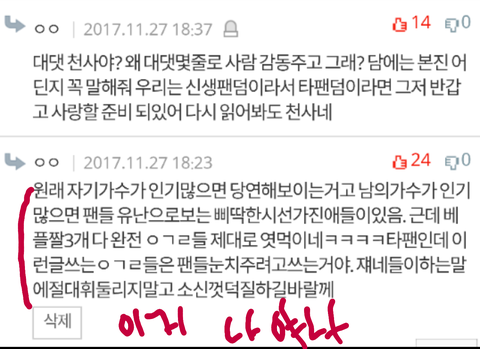 그냥진짜뭣도없는 까글들있잖어ㅋㅋ 인기왜많은지모르겠다 매력뭔지알려달라면서 은근후려치는글 외모까는글 혹은 팬덤까는글. 이런거는 진짜 가수본인한테는 타격1도 없거든. 그냥깔게없으닌까 ㅇㄱㄹ들이 막 던지고보는거야. 근데머글이나 타팬들은 그런까글은 별로신경안써. 결국 그런밑도끝도없는까글신경쓰는건 ㅇㄱㄹ들 그리고 팬들이야. 그런데 ㅇㄱㄹ들은 까면서 희열을느끼는관종들이라 상관없는데 팬들은 상처받고힘드닌까 그게문제거든ㅠㅠ거기에너무감정소비하다가 지치면 안돼. 내가글재주가없어서ㅠ정확히잘전달될런지모르겠는데ㅠㅠ그런글에 대응은하되 진짜감정없는사람처럼? 그렇게굴어야 지치지를않어. 그런글때문에 덕질에 지치기를바라는게 그런글올리는이유거든.