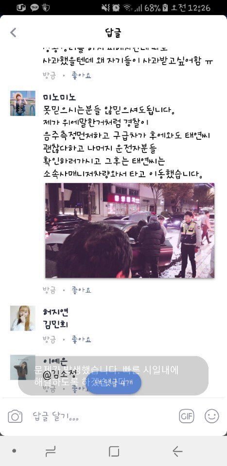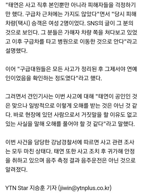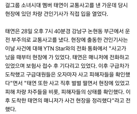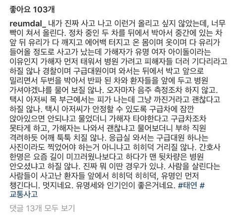 일반인이였음 보험처리하고 끝났을 사건을 태연은 연예인이란 이유로 음주일지도 모른다, 가해자가 구급차 먼저 타고 가다니 __이네 등등 듣지 않아도 될 말을 전부 듣고 감내해야 했음.