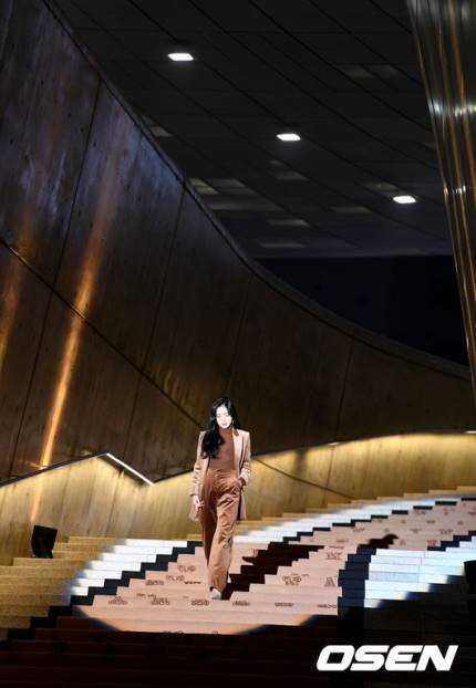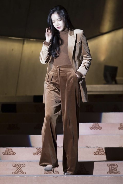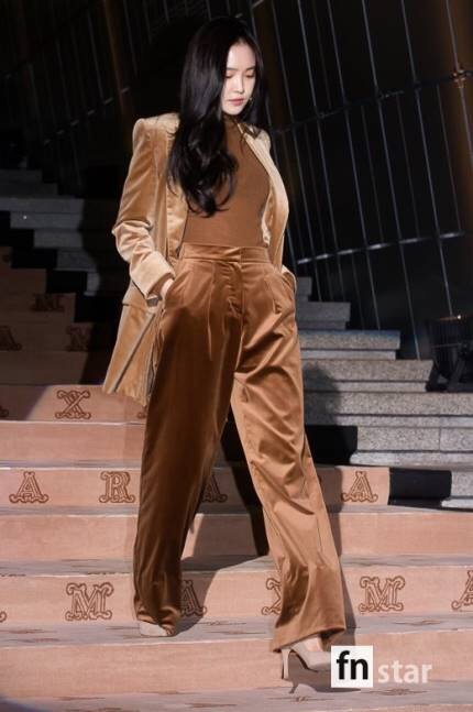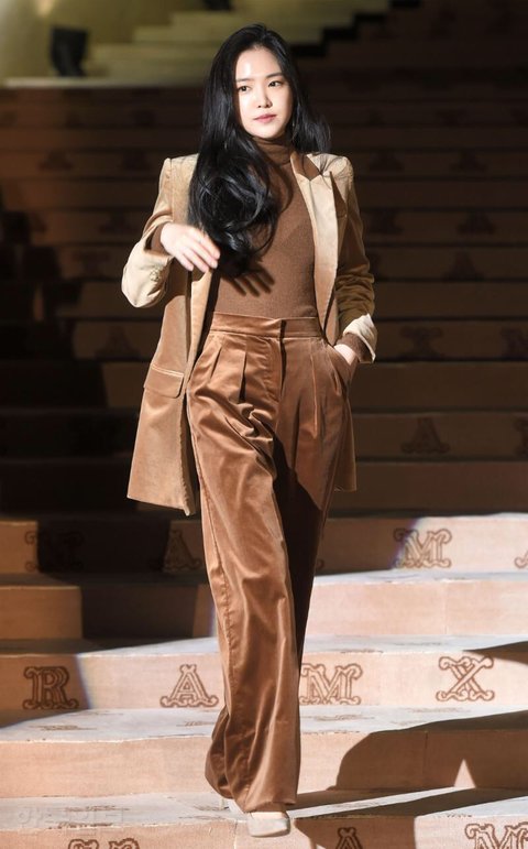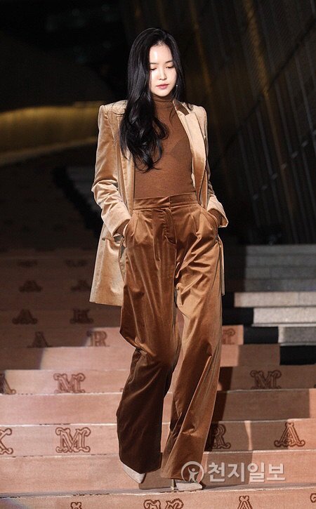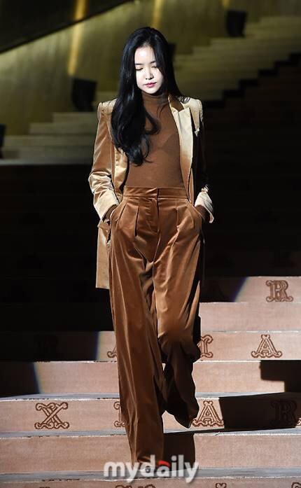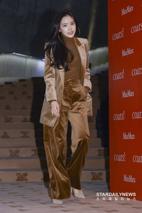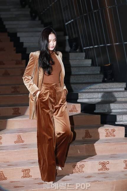 골드벨벳에 통바지 브라운으로 깔맞춤한 스타일로 입고 등장