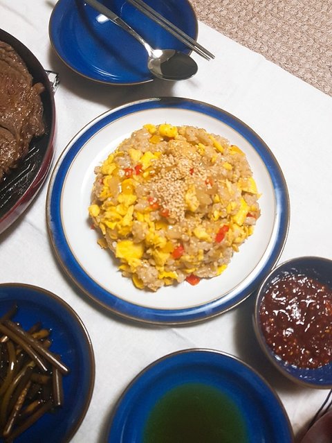 이렇게 차려먹어보았어요. 볶음밥이랑 된장찌개해서-