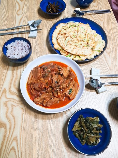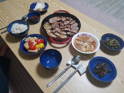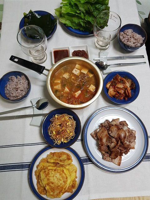 삼겹살 굽고 된장찌개 끓이고 동태전 구워서 친구에게 대접했던 밥상입니다.
