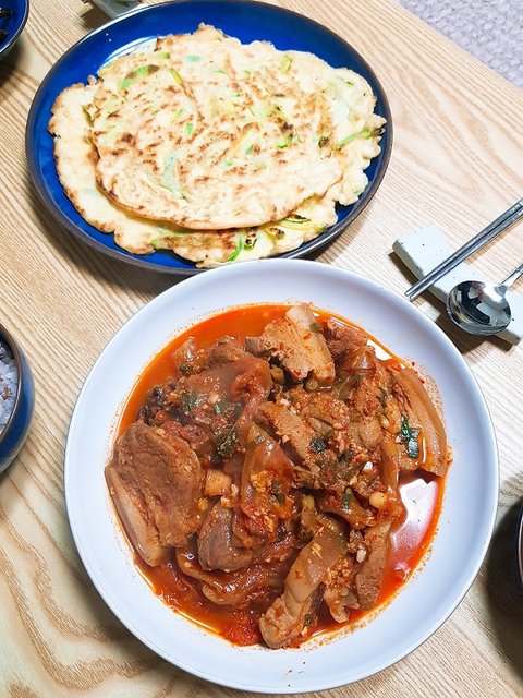 묵은지에 돼지고기 큼직하게 썰어넣고 만든 김치찜에 애호박 썰어서 전구웠어요-!