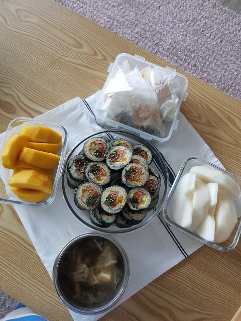 복숭아랑 배랑 깎고 미소된장국 끓여서 소풍 잘 다녀왔습니다!