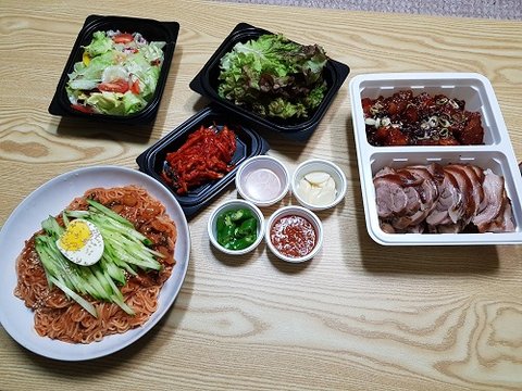동네에 맛있는 족발집에서 보통이랑 매운맛이랑 반반해서 테이크 아웃하고