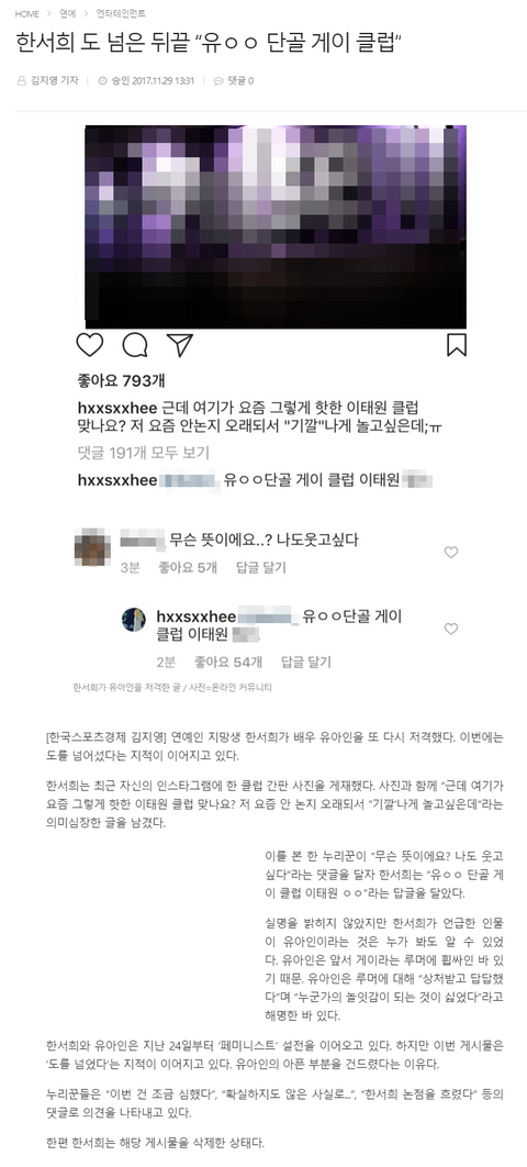 이년은 지가 페미니스트라면서 게이클럽 올리는 의도가 뭔데? 게이클럽다닌다고(사실여부는대중은모름) 게이니 아니니 이런 의도로 게이클럽으로 쪽줄려고 올린거잖아 페미니즘이 뭔데; 성적으로 차별하지말자는 주의인데 저년 도른년이네...유아인도 별로지만 한서희가 더 싫음..마약한주제에