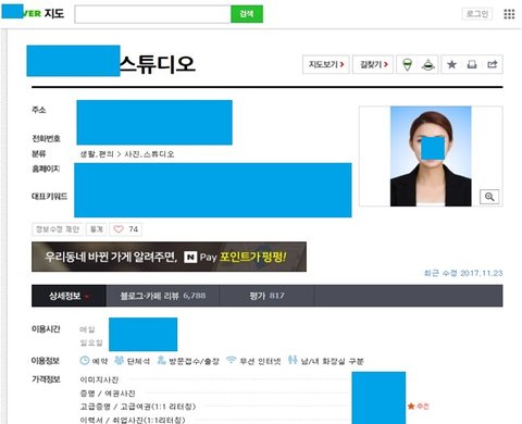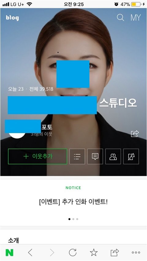 이 때 당시 너무 놀라 혹시나 제 사진이 온라인에서도 이용되고 있을까 싶어서 검색을 해봤더니, 초록창 인터넷의 위치 찾기 메인사진, 사진관 공식 홈페이지로 사용되는 블로그 메인사진, 사진관 다녀온 블로거들의 후기에 모두 제 사진이 떡하니 나와있었습니다. 약 2년이 넘도록 제 사진이 쓰이고 있었더라구요.. 게다가.. ㅇㅁ포토 *스타그램 프로필 사진 마저 제 얼굴이었습니다. *스타그램에도 제 사진으로 만든 홍보물 글이 따로 또 있었구요.