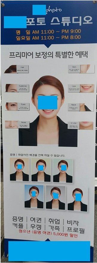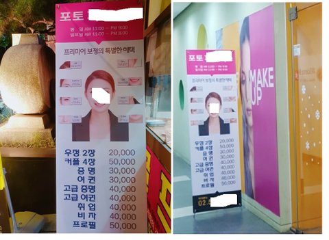 현수막 뿐만 아니라 매장 앞에 세워놓는 Y배너에도 제 얼굴이 있었으며 ‘프리미어 보정의 특별한 혜택’ 이라는 말과 얼굴 부위별 보정이 가능하다며 마치 제 얼굴이 눈 비대칭, 콧볼 축소, 피부 잡티 제거, V라인 비대칭 교정 등 수많은 교정으로 재탄생한 얼굴인 마냥 홍보되고 있었습니다........