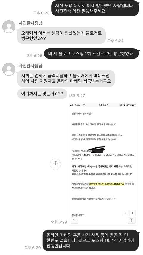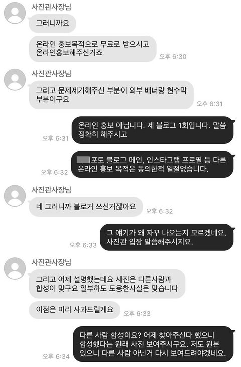 '블로거'의 신분으로서 블로그를 계속 언급하시는 것은 제가 포스팅 댓가를 위한 무료촬영을 했기 때문에 이 문제를 당연하게 받아들여야 한다는 말씀이신가요? 저는 제 블로그 1회 포스팅만을 약속하고 이 촬영을 진행한 것이고 필요하다면 '포스팅만해주시면됩니다' 라는 캡쳐본 올리겠습니다.