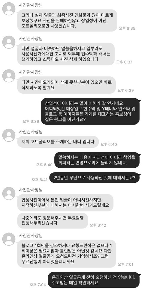 사진관 안에도 많은 분들의 사진이 있길래 이 분들에게는 허락을 받은거냐고 물어봤더니, 그렇다고 합니다. 그러면 왜 저의 경우는 매장 현수막, 온라인에서까지 사용했으면서 저한테는 물어보지 않으셨냐고 했더니 대답을 못하셨어요.