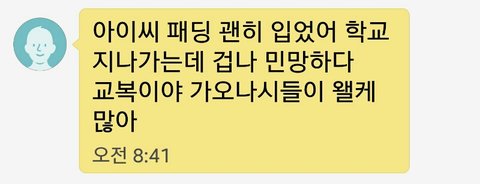 ㅋㅋㅋㅋㅋㅋㅋㅋㅋㅋㅋㅋ 웃기당 엄마가 나 옛날에 입던 롱패딩입고 아침에 회사가셨는데 학교 앞을 지나셨나봐 쪽팔리다고 막 그러고 ㅋㅋㅋㅋㅋㅋ 교복이야 말 뜻이 학생들이 교복처럼 많이 입고 다녀서 그러신거같앙 가오나시 머ㅓㄴ데 ㅋㅋㅋㅋㅋㅋㅋ
