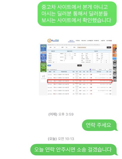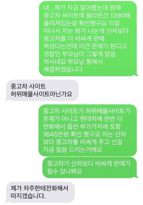 알고보니 제가 구매 한 차량은 신차 출고가격 옵션 vat 포함 1645만원으로 출고가 되고 있었고 딜러분들만 보실수 있는 사이트에 9월달에 판매한 이력에는 1390만원에 판매를 했다고 이력이 남아 있었습니다 저한테는 1710만원에 판매를 하셨는데 말입니다 ;딜러분이 비싸게 팔아 넘기셨다는것에도 화가 나지만 저도 잘 알아보지 못하고 구매를 하였기 때문에 제 책임도 있다고 생각합니다 정말 화가나는건 왜 신차 가격보다 비싸게 판매를 하셨다는겁니다 이럴거면 신차를 샀지 뭐하러 중고차를 샀겠습니까? 현대 차에 전화해서 몇번을 확인을 하고 사이트도 다시 한번 확인한 후 연락을 드렸더니 블랙박스 후방카메라 네비게이션 에어백을 뺀 가격이 1645만원이다 그걸 포함 하면 가격이 달라진다라고 말씀을 주셨는데 장난합니까? 에어백도 옵션인가요? 옵션과 vat포함 가격이라고 다시 한번 말씀 드렸더니 돌아오는 답변은 차주분 연락처를 알려주겠다 차주분에게 내가 따지겠다 뭐하자는겁니까?정말 아무리 차에 대해 1도 모르는 20대 초반 여자라고 해도 그렇지 적당히 속였어야죠 아이폰이라 통화녹음이 안되기에 혹시 모를일을 대비해 문자로 증거자료를 남기기 위해 문자로 했더니 정말 잘한일이라고 생각합니다 현재 소송을 알아보고 있고 저는 제 의사 똑똑히 밝혔고 오늘까지 연락 없으시면 고소 하겠습니다 딜러분도 누군가의 소중한 자식일텐데 양심적이게 부모님 부끄럽지 않게 삽시다 마진을 많이 남기고 싶으셨다면 신차보다는 저렴하게 판매를 하셨어야죠 이 글 보시면 연락 부탁드립니다 그리고 이 글 읽고 계신 분들은 저도 인천 부천에서는 거래 하지 말라는 말을 여러번 들었지만 인천 부천에서 거래 하지 마세요 다른 지역에도 사기 치는 딜러분들 수두룩 하겠지만 제!발! 양심적이게 삽시다 (+ 우린 강매 하지도 않았고 허위매물 판것도 아니니 법에 걸릴거 없다 배째라식으로 나오는 딜러분 알겠습니다 법으로 처리할수 밖에요 법에 걸리는지 안걸리는지 제가 제대로 확인도 안하고 당당하게 법적으로 대응하겠다 했겠습니까? 그리고 법에 걸리든 안걸리든 양심적으로 죄송하다 최소한의 합의를 해드리겠다라고 나와야지 참 대단도하십니다 원래 차주분 연락처 주신다더니 알고보니 그 번호도 오늘 연락 온 직원분 번호였네요ㅋㅋㅋㅋㅋㅋㅋㅋㅋㅋㅋㅋㅋㅋㅋㅋㅋ그리고 페이스북 페이지에 댓글 달았는데 왜 자꾸 지우세요 나 차단까지 하시고 ㅋㅎ 이 팀장님 . )