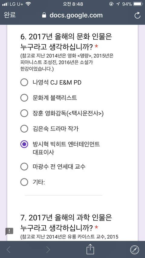 총문항 10개임. 방피디님은 6번에 방탄은 8번에 있어.