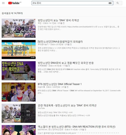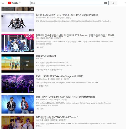 뭔가 했더니 DNA 뮤비가 유튭 검색해서 안뜬대.