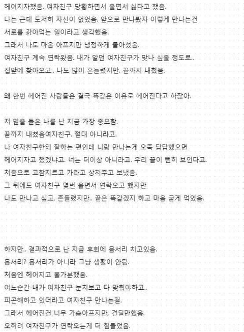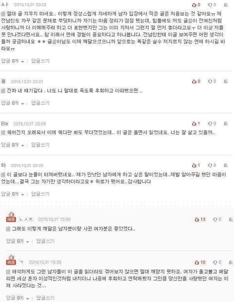 저걸 깨닫는 남자도 진짜 드문 케이스.. 대부분은 나이 쳐먹고도 여자탓만 하고 자기 잘못에 대해서 생각도 안함.