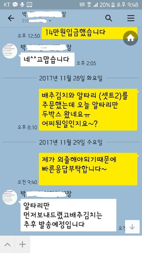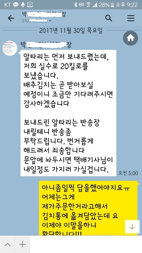 2. 알타리 2박스가 와서 배송 잘못온것 같다고 연락함 (전화 절대 안받아서 카톡함)