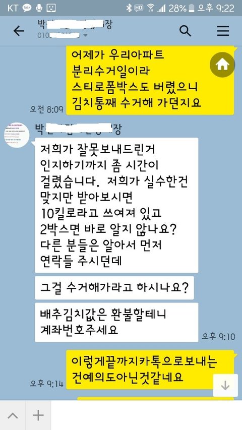 5. 택배박스는 이미 버렸고 김치통에 있으니 수거해가라고함