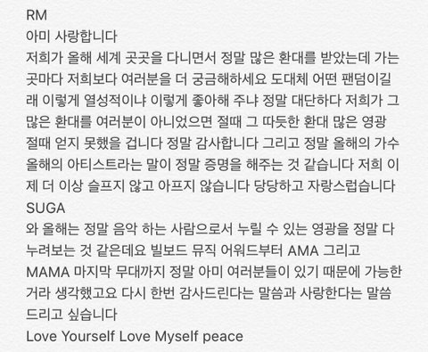 애들은 우리에게 정말 진심으로 고마워 하고 있고 우리는 방탄 모두 그리고 김남준이 리더라서 고맙다는 것이다 항상 수상소감으로 우리를 감동시키는 남준이...ㅠㅠ 진짜 고맙고 사랑해