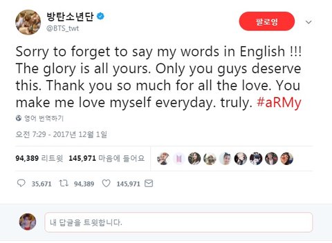 영어로 말하는걸 잊어서 죄송해요!!! 모든 영광은 당신들 것입니다. 당신들만이 그 자격이 있어요. 그 모든사랑에 너무 감사드려요. 여러분은 제가 제 자신을 매일 사랑하게 만듭니다. 진실로요.