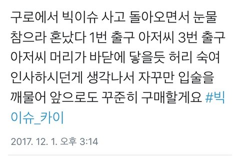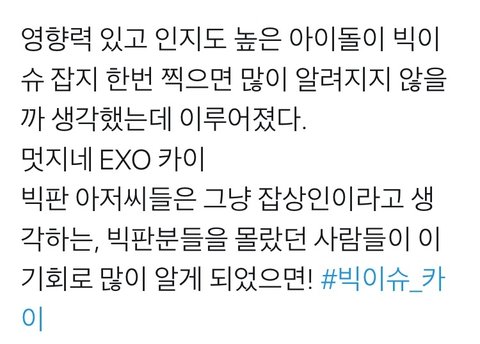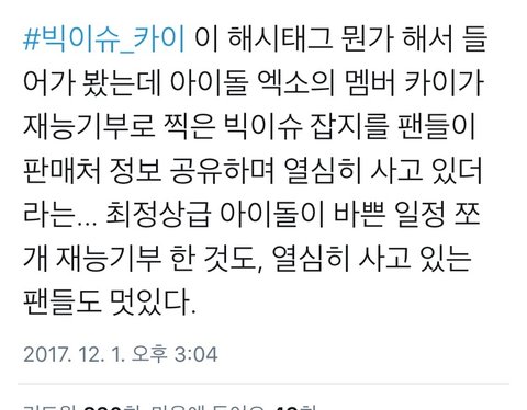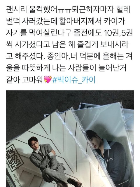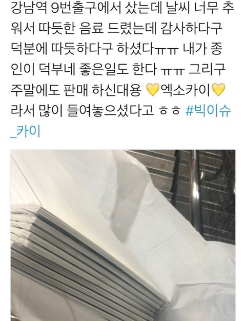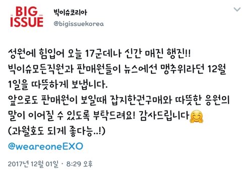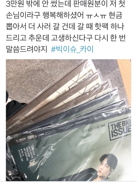 어제 톡선에서 본사람들은 알꺼임 홈리스분들을 돕는 잡지인 빅이슈의 이번달 모델이 엑소카이였고 12월 1일 부터 판매가 시작됐어. 오늘은 훈훈한 그 후기를 보여주려고해