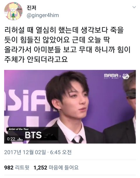 정국이 무대에서 아미보고 주체가 안됐대