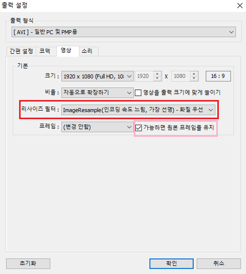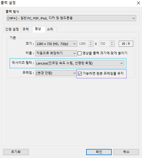 'Lanczos' 로 일반적으로 사용하여, 영상과 소리의 비매칭, 렉 & 느려짐, 끊김, 용량 감소, 인코딩 불가 등 해결하면 됩니다.