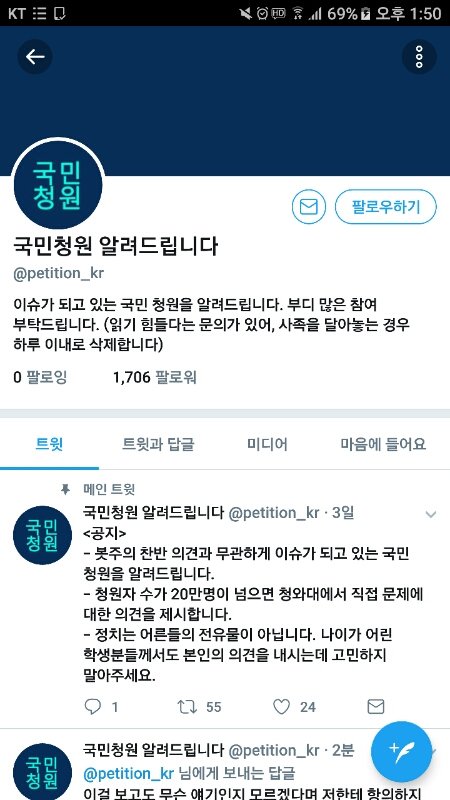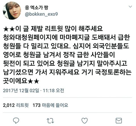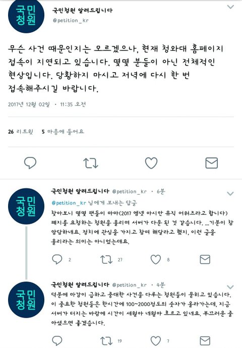 아니 청와대가 저런거 들어주는 곳이냐 저게 공식계정이든 아니든 창피해해야할 일임;;