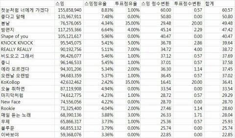 이 표가 성적과 투표 모두 합산한 표인데 직접 계산해 보면 에일리와 11점 차이 밖에 안나