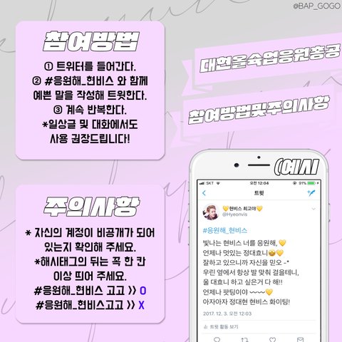 안녕! 나 짹 총공팀인데 내일 짹에서 대현 올슉업 응원 해시태그 총공 하려고 하는데 같이 해줬으면 좋겠어서 들어왔어! 혹시 짹하는 사람 있으면 @BAP_GOGO 들어와서 알티 좀 해줘! 매일 늦게 공지해줘서 미안해ㅠㅠ