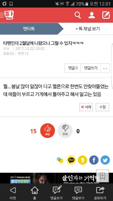 저는 팬덤끼리의 싸움이 가수에게까지 알려지는것이 옳지 않다고 보는 한 사람으로써 이번 처럼 봉을 다같이 끈다거나 전에 있었던 실트사건같은 일은 진짜 잘못되었다고 생각합니다. 그래서 예전부터 사과문을 올리자고 엑톡과 트위터에도 여러번 글을 올렸었지만 엑소엘의 성향상 작은 목소리는 무시당하고 조금이라도 다른 의견을 내면 어그로 취급을 당해버리죠.. 그래서 아무리 저같이 생각하는 몇몇의 엑소엘들이 사과문을 쓰자고 해도 진짜 다같이 의견을 모아 방탄소년단 팬분들에게 사과하기 까지에는 긴 시간이 걸릴것 같습니다. 그렇기에 저라도 대신 사과의 말씀을 드리고 싶습니다. 저는 수많은 엑소엘중 하나일 뿐이고 많은 사람의 의견을 모아올린 글도 아니기 때문에 별 위로가 되지 않으실 수도 있지만 적어도 저처럼 생각하는 엑소엘이 각 커뮤에 자리잡고 있을것입니다. 저는 그렇게 믿고 있어요.. 나중에라도 꼭 많은 엑소엘의 의견을 모아 사과문을 올려보도록 노력하겠습니다. 네이트판에서는 불가능 하더라도 트위터나 타 커뮤를 이용해서라도요... 엔터에도 무분별한 방탄소년단 욕들이 쏟아지길래 사진과 같은 글도 올렸었구요.. 그냥 딱 저같은 엑소엘도 있다는것만 알아주셨으면 좋겠습니다. 정말 죄송합니다 아미분들..