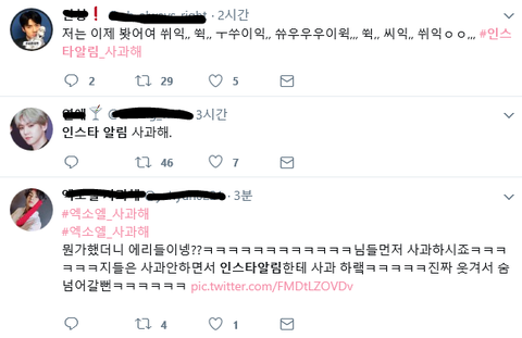 현 엑셀들 상황 : '인스타알림'을 실트로 띄움. 해시태그만 사용한게 아니라 이게 실트까지 오를 정도로. 인스타알림_사과해 는 #엑소엘_사과해를 조롱하고 비꼬는 해시태그임. 이래도 엑셀들 태도가 정상이냐? 애초에 진심으로 사과할 마음은 있어? ㅉㅉ