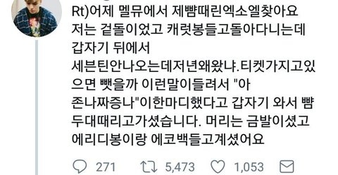 슬슬 피코질하네 엑소엘들.. 저거 떴을때 캐럿들 처음부터 인증없으니 주작이라고 걸렀다 캐럿 이용해서 피해자 코스프레 하지말고 셉틴 언급도 하지마라 제발 너네 일은 너네가 알아서 해결해 가만히 있던 타팬덤 머리채 잡지말고