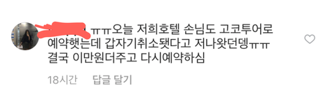 사장님께 12/13일자로 예약을 했던 사람인데 혹시 취소되었냐고 하니, 아침에 숙박예약대행사이트에서 전화가 와서 고객 개인사정으로 취소를 한다고 했답니다.
