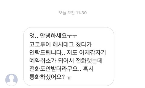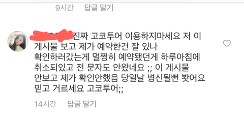 고객센터 연락이 그렇게 안되더니, 제가 고코투어 인스타그램에 댓글을 달았어요. 험한말을 했죠. 그랬더니 저녁 7시가 넘어서 전화가 왔어요. 팀장이라며,