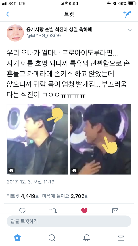 정법 가는길에 팬들이 계속 잘생겼다 잘생겼다해서 호범님한테 얼굴 묻어버리는거ㅋㅋㅋㅋ부끄러워하는 석진이 세상에서 제일 귀여워