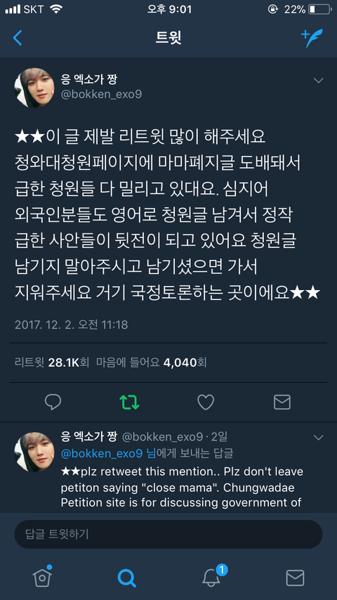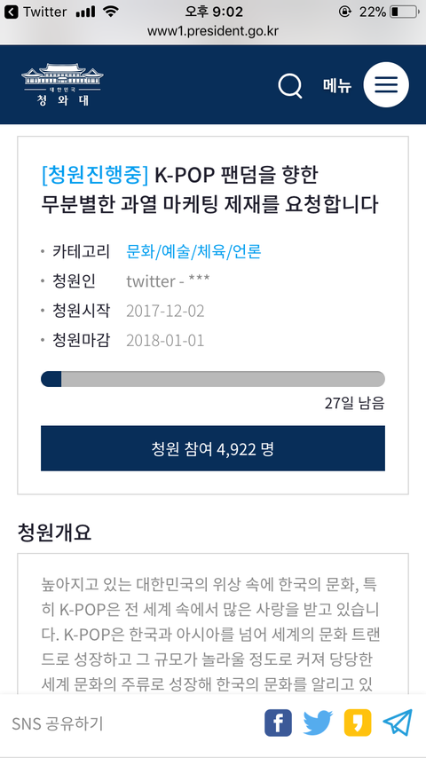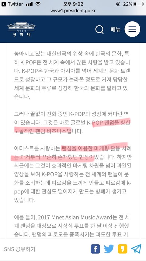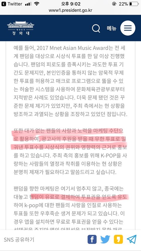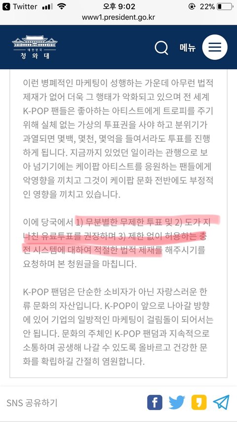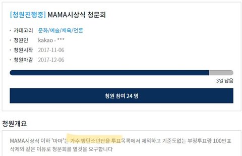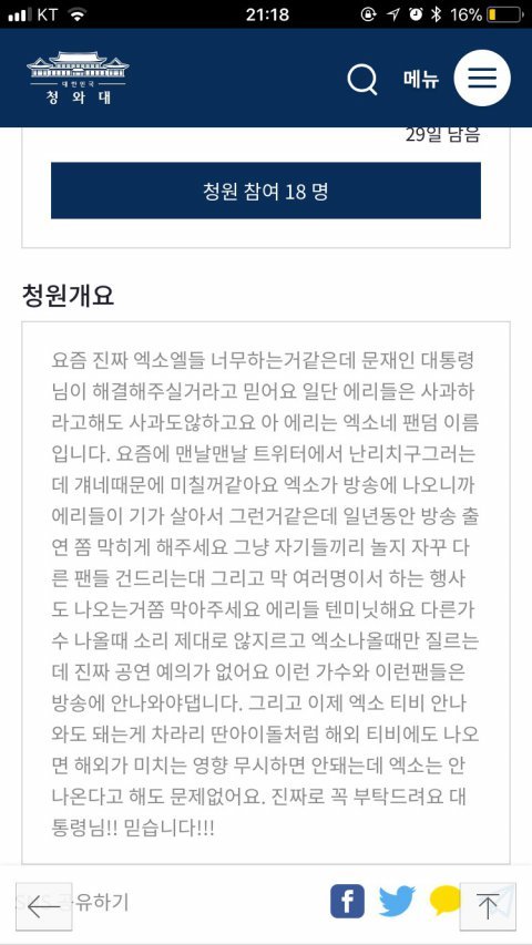 +) 그리고 청원글 올리는 걸 우리가 도와주라 했다고 하면 우리는 마마폐지청원을 도와 달라고 한 것이 아니라 맨 마지막에 있는 엑1연이 올린 청원이 모든 팬덤에게 해당되는 것이니 참여해달라 한것