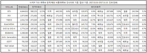 빅뱅: 올해는 음원을 안냈음에도 기존 유툽 깔린것만으로도 이수치, 일본에서위 인기에 힘입어 높은 일본 비중이 눈이 띈다