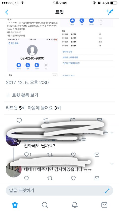 그래서 내가 요즘 짹에서 엑소 조롱하고 그런거 많다고 그거때문에 지금 엑소팬들이 에스엠한테 엑소를 그렇게 조롱하는 사람들 고소하라는 말이 많다고 했더니 대표로 전화하는거녜 그래서 얼떨결에 네네 이랬더니 내 이름이랑 전화번호 물어보더만은 알겠다고 이렇게 전해준다더라