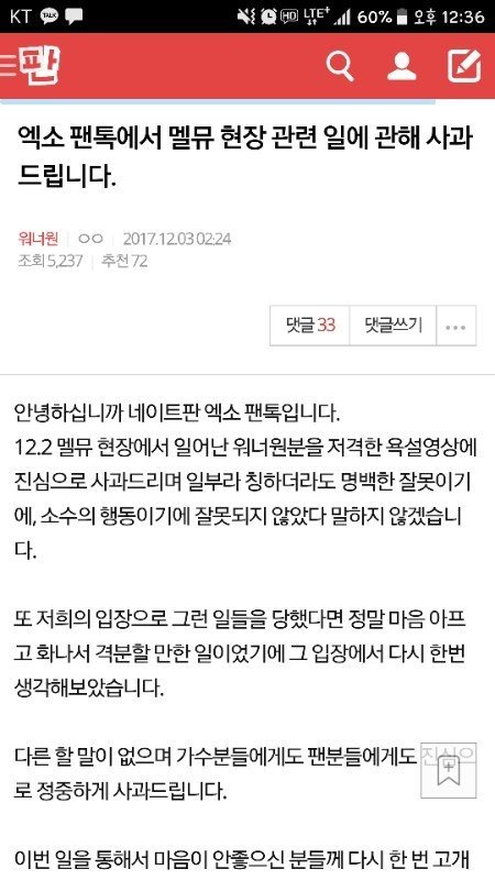 엑소팬톡에서 당사자 사과해와 워너원 죄송합니다. 라는 실트총공이 있었다는것 사실입니다. 지금 당장 엑톡가서 했던사람 나오라고 하니 바로나오네요.
