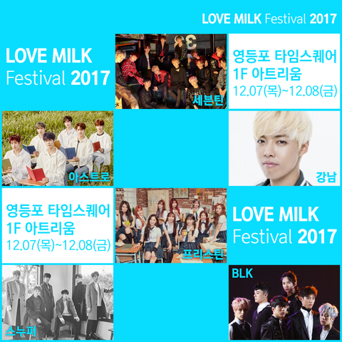 연말연시를 맞아 쇼핑몰을 찾은 쇼핑객들과 청소년을 대상으로하는"러브밀크콘서트"라고 합니다. 축하무대 외에 유업체 무료 시식, 우유요리 전시, 러브 밀크 포토존, 러브밀크 4행시 대회, 러브 밀크 케리커처 등의 다양한 행사가 진행 된다고 합니다!!!