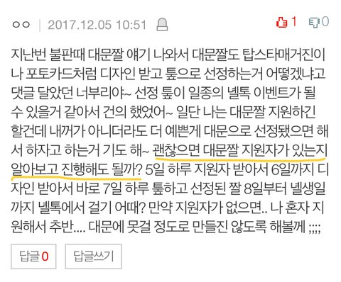 이 부분은 대문짤 아이디어 내준 녤부리 의견대로 오늘(5일)까지 지원받고 내일(6일)까지 일단 디자인 준비하는게 좋을것같아~그 다음부터는 내일 불판에서 의견나누는걸로..!ㅎㅎ