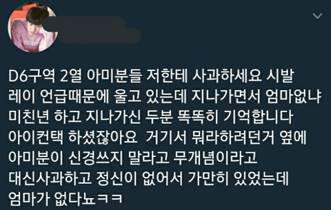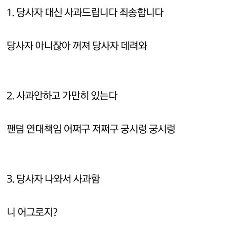 일단 타가수를 욕한건 당사자가 당연히 나와서 사과를 해야 될 문제 맞습니다 이건 엑소엘이 봐도 사과해야 되는데 왜 도대체 당사자가 아닌 '팬덤'한테 그 사과를 요구하냐 이 말입니다,,,예,,? 멜뮤어 하기 전에 친구들이랑 조따 놀고와서 겁1내 피곤해서 잠들언는데 일어나보니 타팬 트친이 뎀으로 사과하라고 왔습니다 예???? 이게 말이 되는 상황임??????????