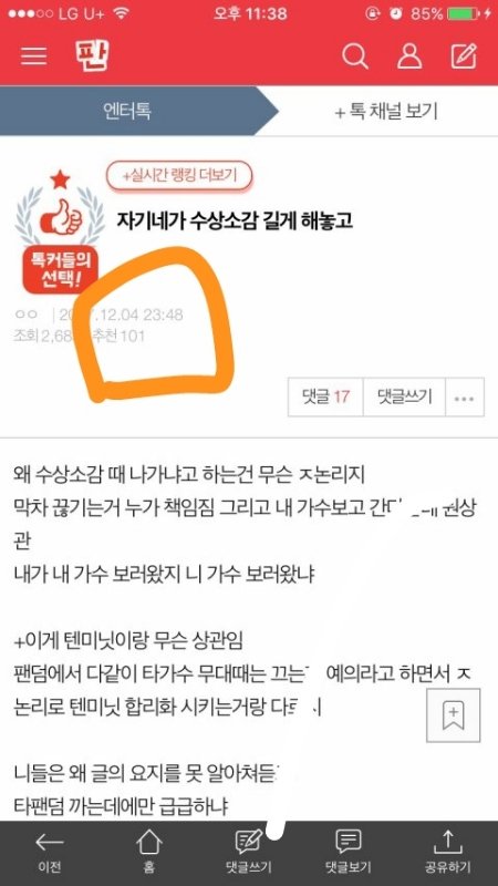 우리 수상소감할 때 쟤네 팬덤이 나가는 사진도 있는데 너무 밑에 있어서 찾아볼게 조카 어이없네 ㅅㅂ 수상소감할 때 단체로 나가는거랑 ㅌㅁㄴ이랑 다를 게 없단다 미친년들 저런 글에 추천수 백개 박제