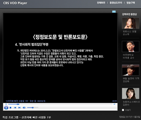 안녕하세요CBS 방송을 즐겨보는 애청자입니다저도 기독교인으로서 기독교 방송을 보고있지요그런데 얼마전에 늦게 퇴근하여 잠들때까지 cbs를 켜놓고 누웠는데 정정반론보도를하는것을 보게되었는데요"신천지에 빠진사람들 " 방송을봤을때너무나 큰 충격이라 정말 사실일까? 하는 의심을 가졌지만 CBS 방송국이고또 언론보도를 하였기에 정말이겠지 생각하고 신천지를 몹쓸 집단으로 생각했죠~그런데 왠 일 일까요?"신천지에 빠진 사람들"의 프로를 정정반론보도를 하는 것이였습니다그런데 왜 새벽에 정정반론보도를 했는지 궁금증을 갖게되었지요